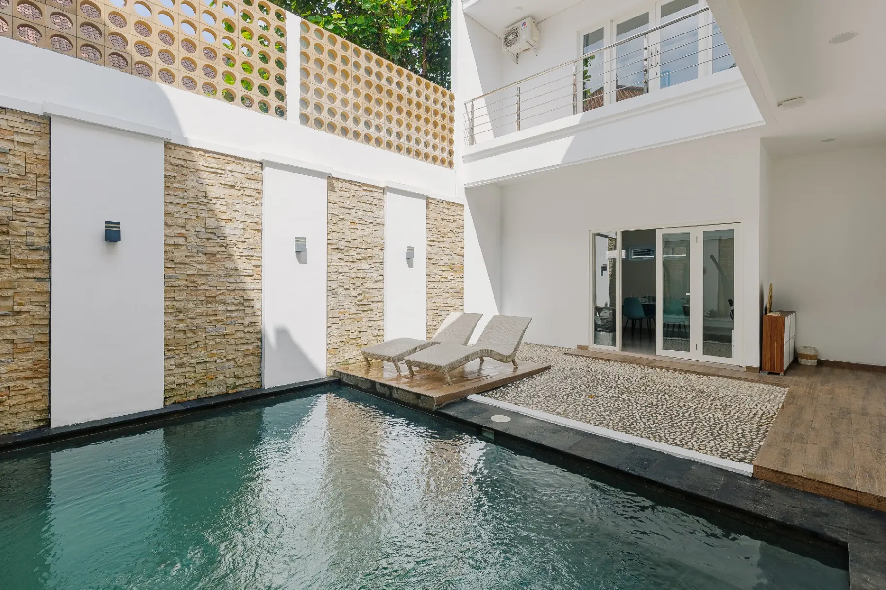 Experience Canggu bliss at the stylish three-bedroom Gloen Canggu Villa. This modern retreat offers a fully equipped kitchen, an inviting dining area, and a private courtyard featuring a refreshing pool and cozy sun loungers—perfect for relaxing under the sun.
