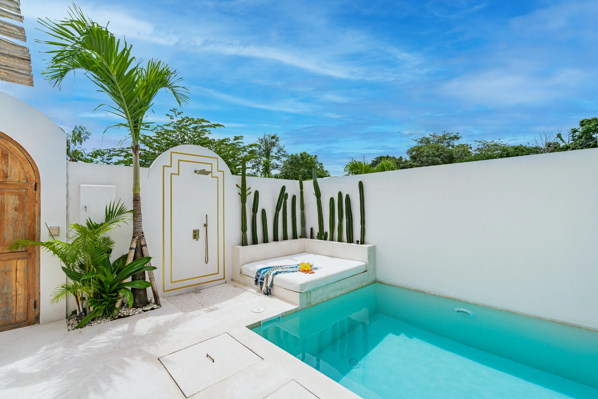 Step outside to your own tranquil pool, private patio, and refreshing outdoor shower — perfect for unwinding at any time of day.