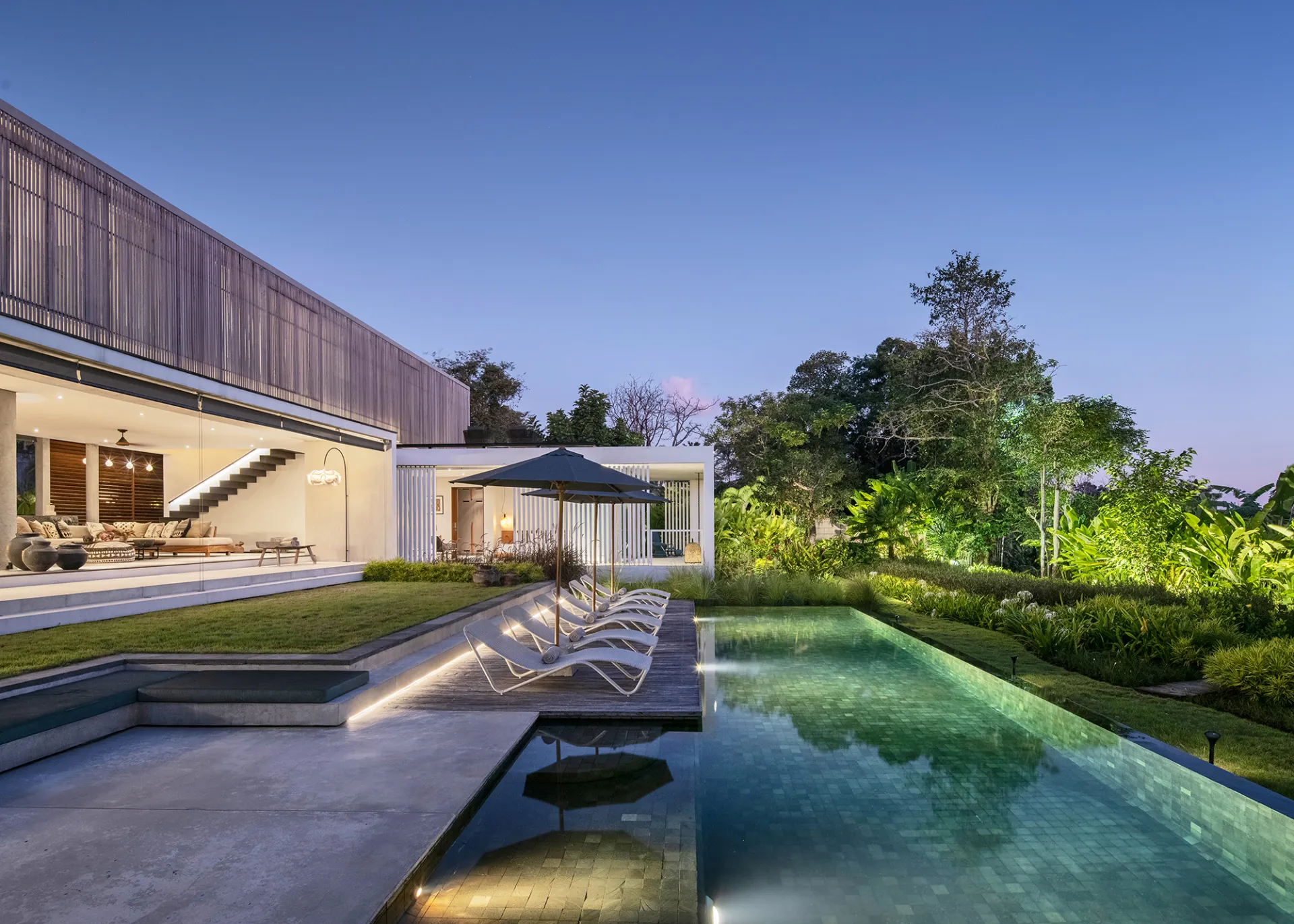 Spanning two levels, the villa is characterized by a contemporary and tropical architecture.