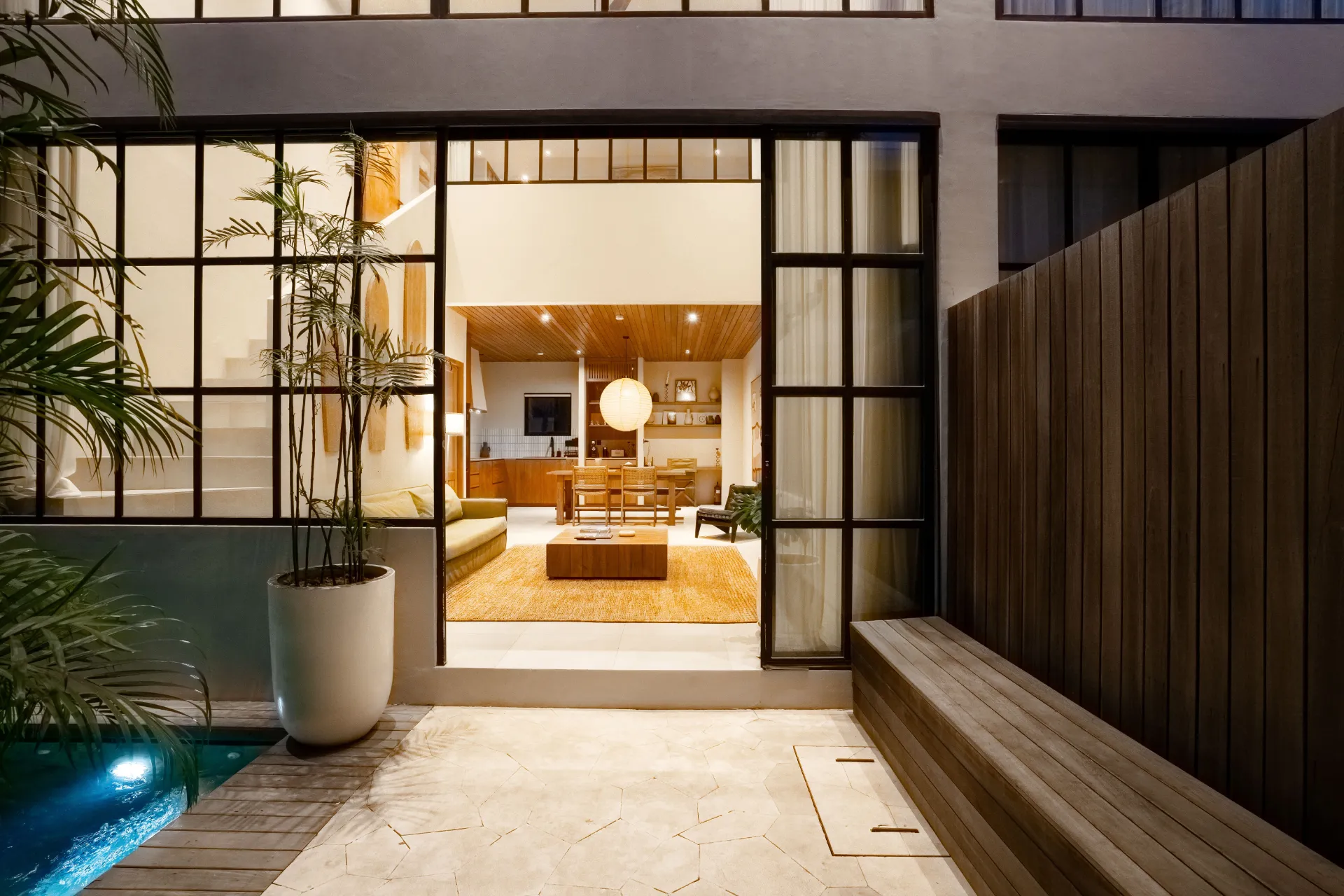 Indulge in tropical elegance loft at Lume, where floor-to-ceiling windows, a statement bathroom, work spaces in each level, and chic interiors set the tone for a modern island escape.