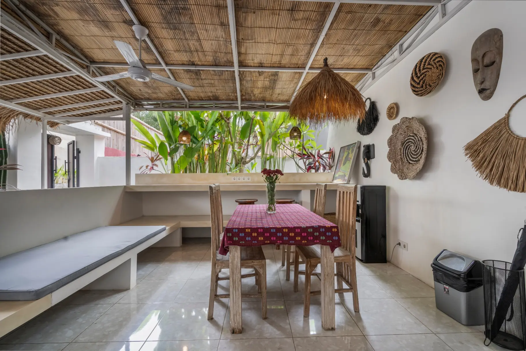 Stay at Villa Gajah in Pererenan, a thoughtfully designed 1BR villa that blends traditional elements with modern comfort. It features a semi-open-plan living and dining area, accented with artistic decorative touches and a tropical ambiance.