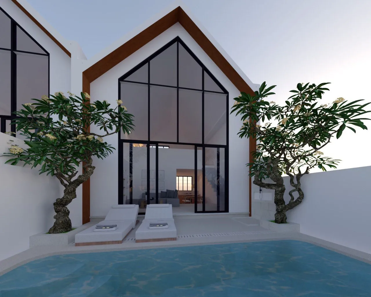 This is Unit A, the first unit of the villas, available for yearly rent starting in now. It is a modern mezzanine-style villa located in Pererenan Sempol. The property is conveniently situated just 7 minutes from Pererenan Beach and is surrounded by many cafes. Subleasing is possible.