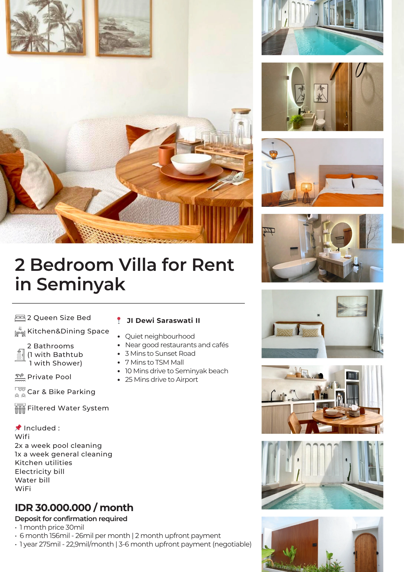 A cozy and stylish 2-bedroom villa located in a quiet and comfortable area of Jl. Dewi Saraswati, Seminyak. Ideal for long-term living with complete amenities and great accessibility.