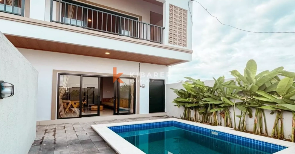 This modern two-story villa is located in Abianbase, just 20 minutes from Green School, making it an ideal home for families or a smart investment opportunity. Sitting on a 100 sqm plot with a 105 sqm building size, the property offers a well-designed layout with an open-plan living and dining area, warm wooden finishes, and a minimalist kitchen. Large sliding glass doors invite natural light and provide seamless access to the outdoor space.