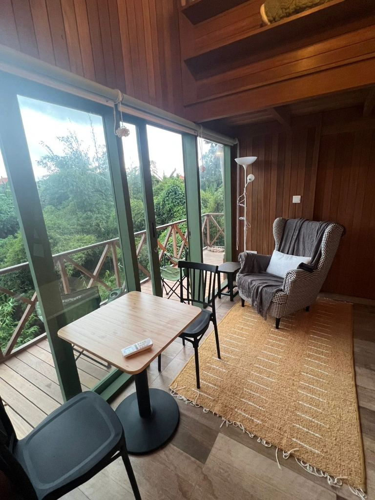 The cabin features a thoughtfully designed interior with wooden finishes, a comfortable bedroom area, a private bathroom, and a functional kitchen, creating a practical space for everyday living. Large windows and a private balcony allow plenty of natural light and offer relaxing views of the surrounding greenery, making the space perfect for working from home or enjoying a slower lifestyle.