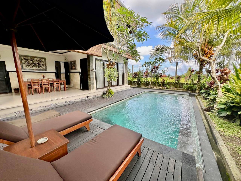 Entire 2-bedroom private pool villa overlooking rice paddies & mountains, just ~10 minutes’ drive west/north of Ubud’s cafes and shopping areas. Perfect for short-term or long-term stays.