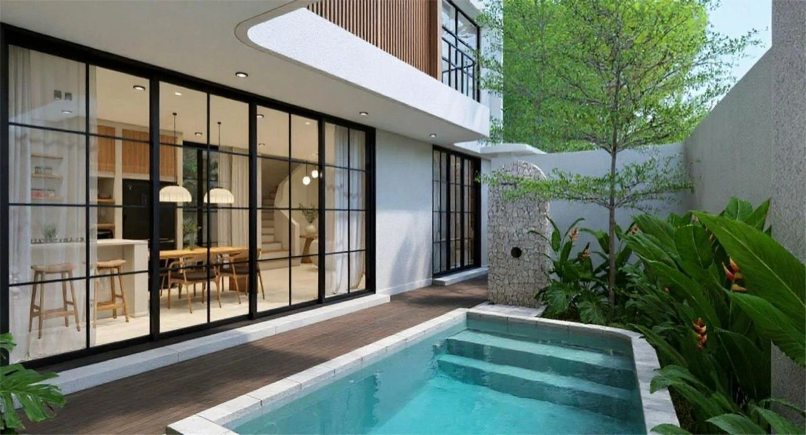 Set on 126 sqm of land with a planned 113 sqm two-storey build, the villa has been carefully designed for smart use of space, natural light, and contemporary finishes. The ground floor layout opens with floor-to-ceiling glass doors connecting the living and dining area to a private pool and garden. A sleek kitchen is included in the plans, while upstairs the bedroom will offer privacy and access to a spacious balcony with ocean views. The highlight is the private sauna and cold plunge on the rooftop lounge—rare additions for a one-bedroom villa that will bring a resort-style experience to daily living.