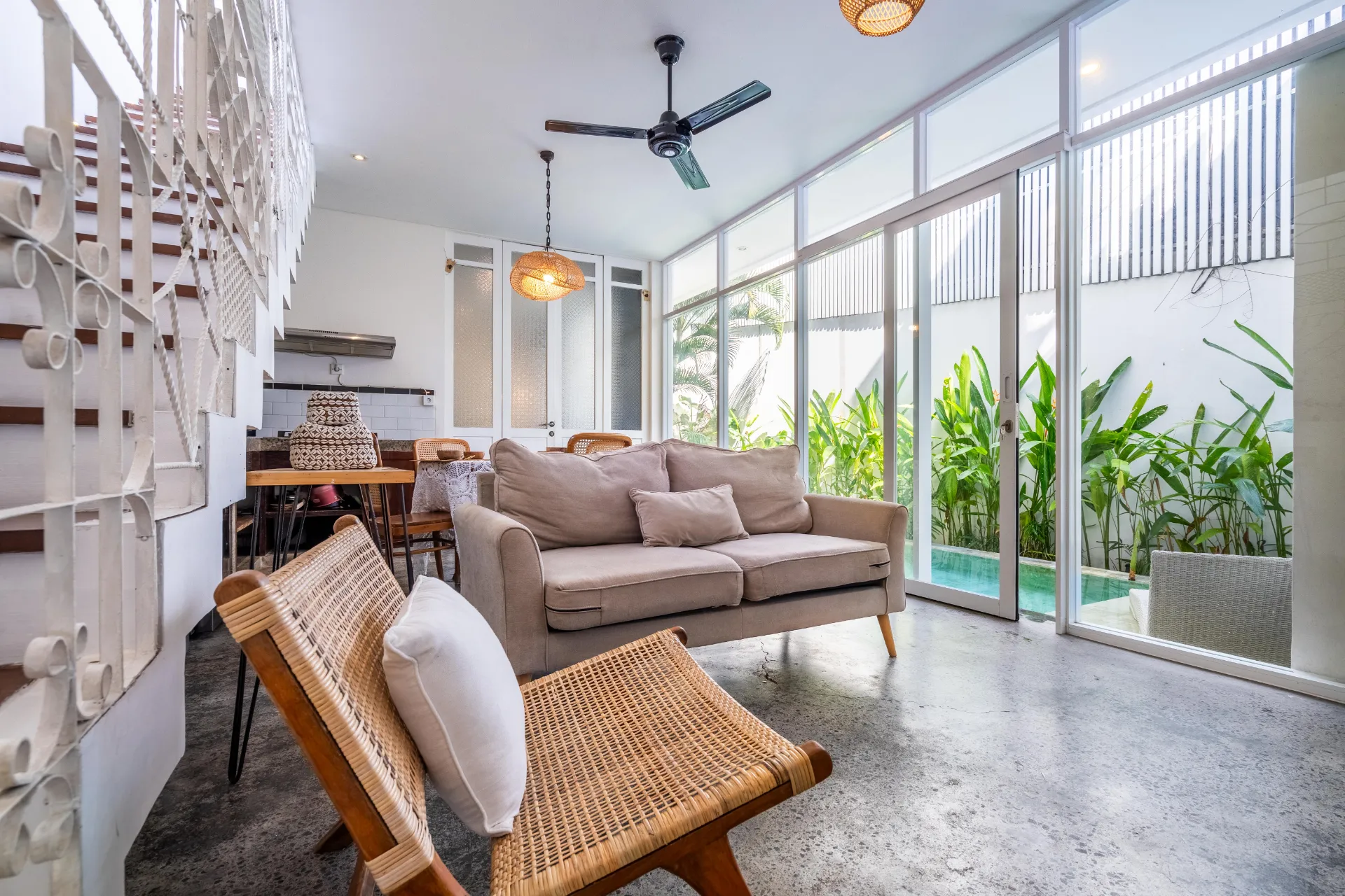 Designed with a bright tropical aesthetic, the villa features an inviting private pool surrounded by lush greenery, creating a relaxing oasis right at home. Large glass sliding doors fill the living and dining area with natural light, seamlessly connecting indoor and outdoor spaces.