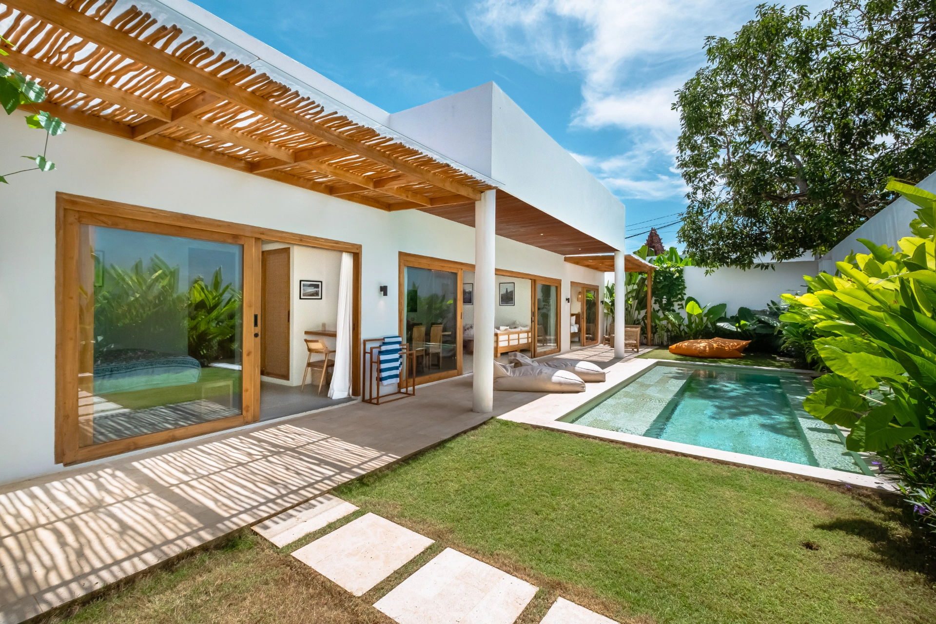 The bright, open-plan living area is fully air-conditioned and includes a well-equipped kitchen with a stove, refrigerator, microwave, Nespresso coffee machine, hot and cold water dispenser, and boiler—everything you need for a seamless stay. Large sliding doors allow you to either keep the space cool on warmer days or open it fully to connect with the pool area and outdoor living.