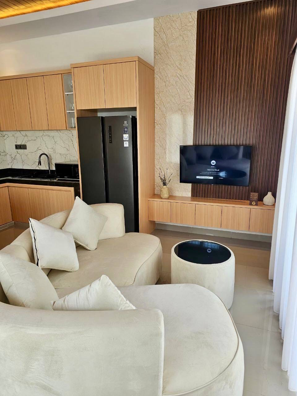 This villa features a fully enclosed living room with air conditioning, offering a cool and comfortable atmosphere all day long — perfect for relaxing, working from home, or enjoying quiet evenings.