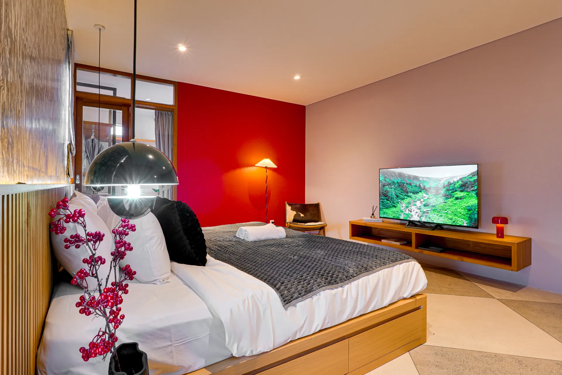 Both bedrooms are surprisingly spacious, a rarity in Bali apartments. One features a smart TV, while the other has a vanity corner - offering equal luxury for couples or friends traveling together. The two modern en-suite bathrooms are bright and airy with windows that bring in natural light, stocked with essential amenities for a comfortableĀ stay.