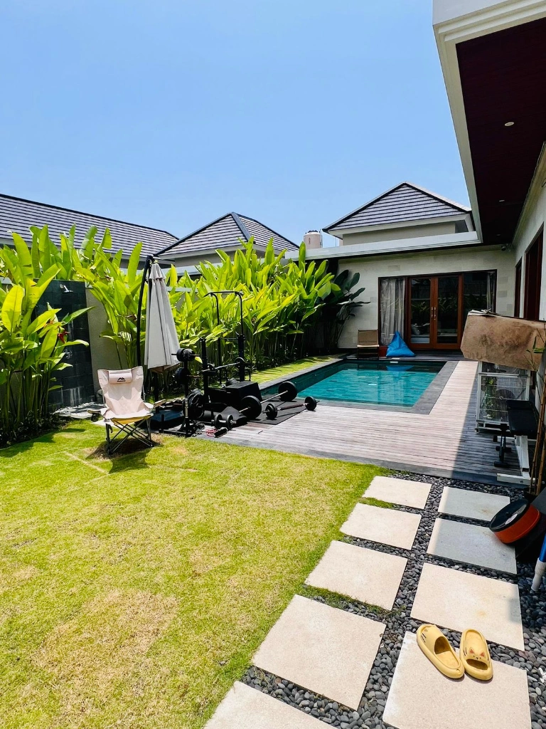 This tropical modern villa features a clean architectural layout with a lush garden, wooden pool deck, and minimalist outdoor styling, creating a calm and private living environment. The outdoor area is designed for both relaxation and light activity, blending greenery with modern comfort.