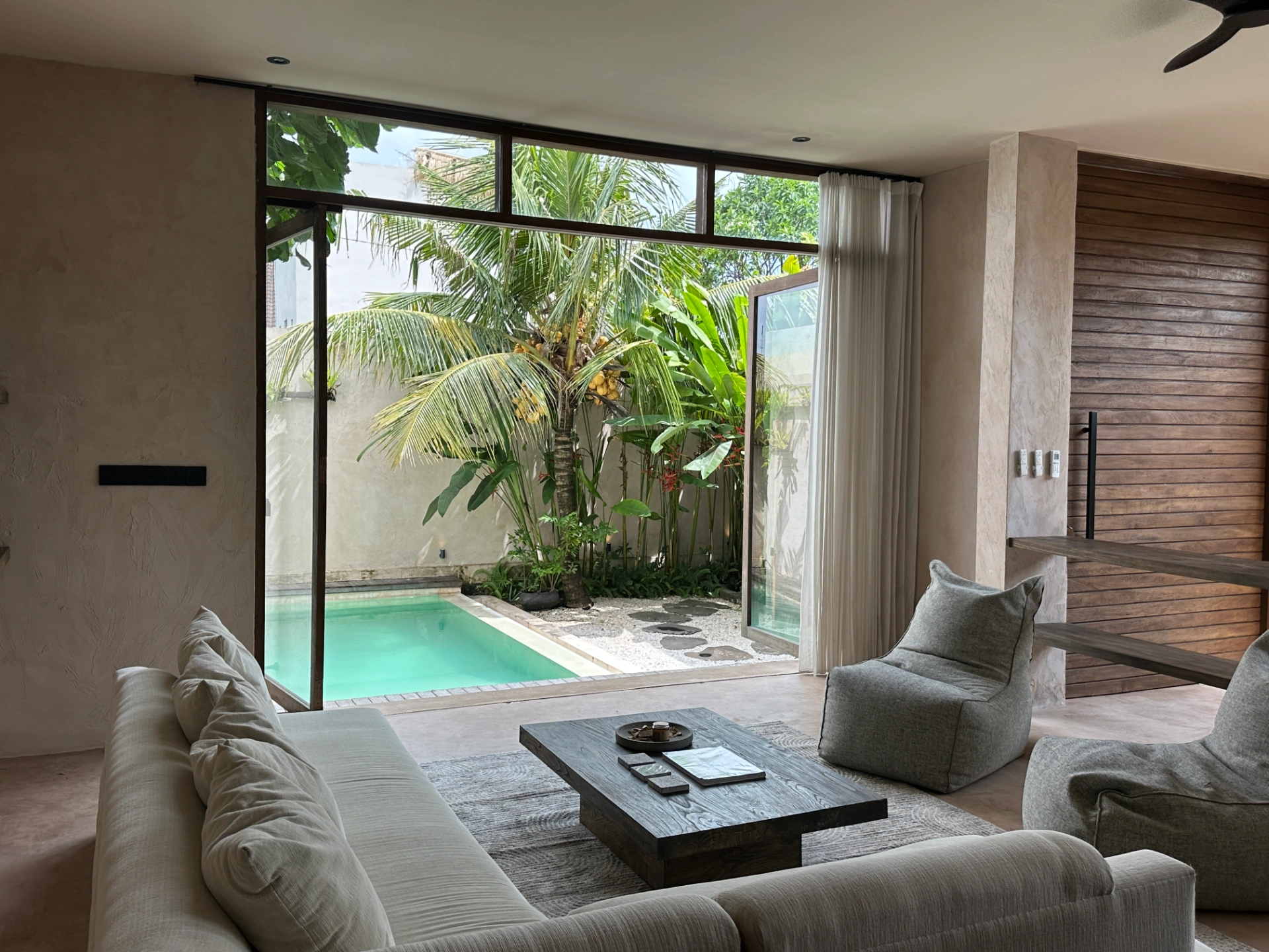 Step outside to your private pool area, surrounded by clean architectural lines and natural elementsâideal for relaxing or enjoying quiet moments at home.