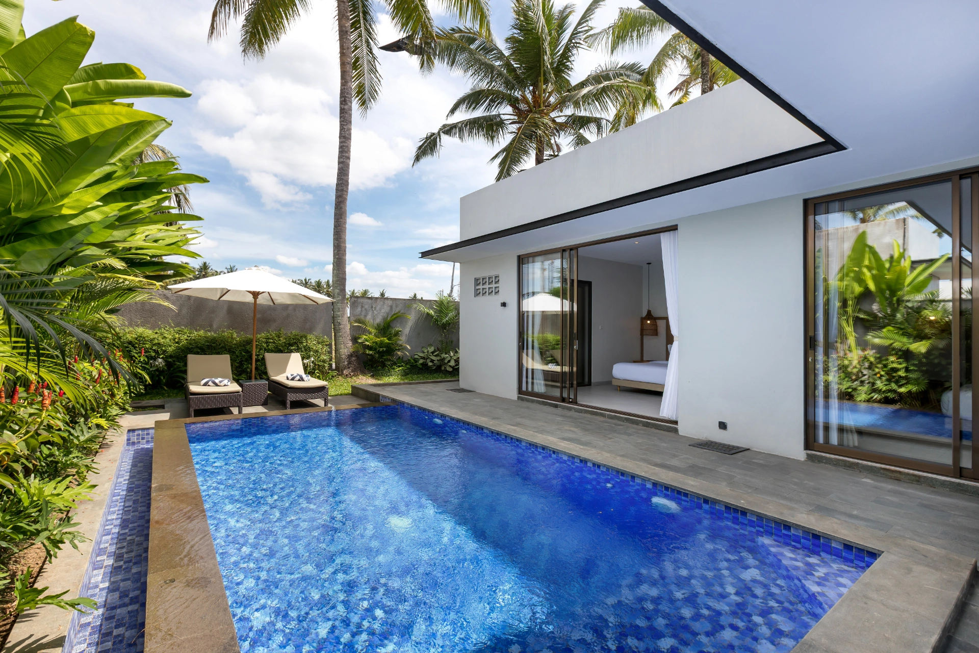 The villa features a bright open-plan living and dining area, designed to connect seamlessly with the outdoor space. Large glass doors bring in natural light and offer direct access to the private swimming pool, creating a relaxed and homey atmosphere.