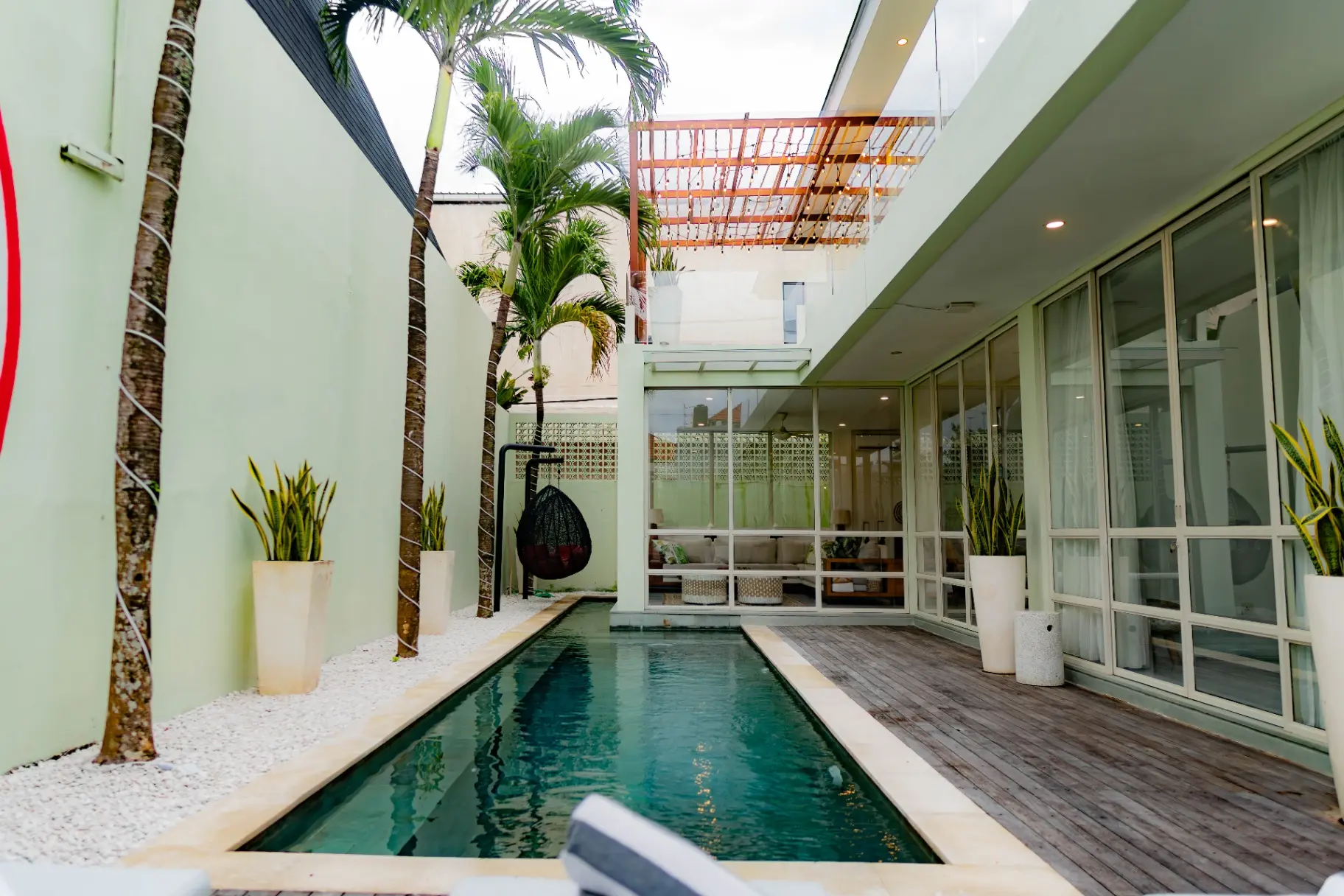 Looking for a spacious and fully equipped 130m2 villa in the heart of Canggu? Secret Heart Villa offers a beautiful 2-bedroom retreat on the 1st floor of a private 2-story villa, featuring an outdoor pool and enclosed living space.